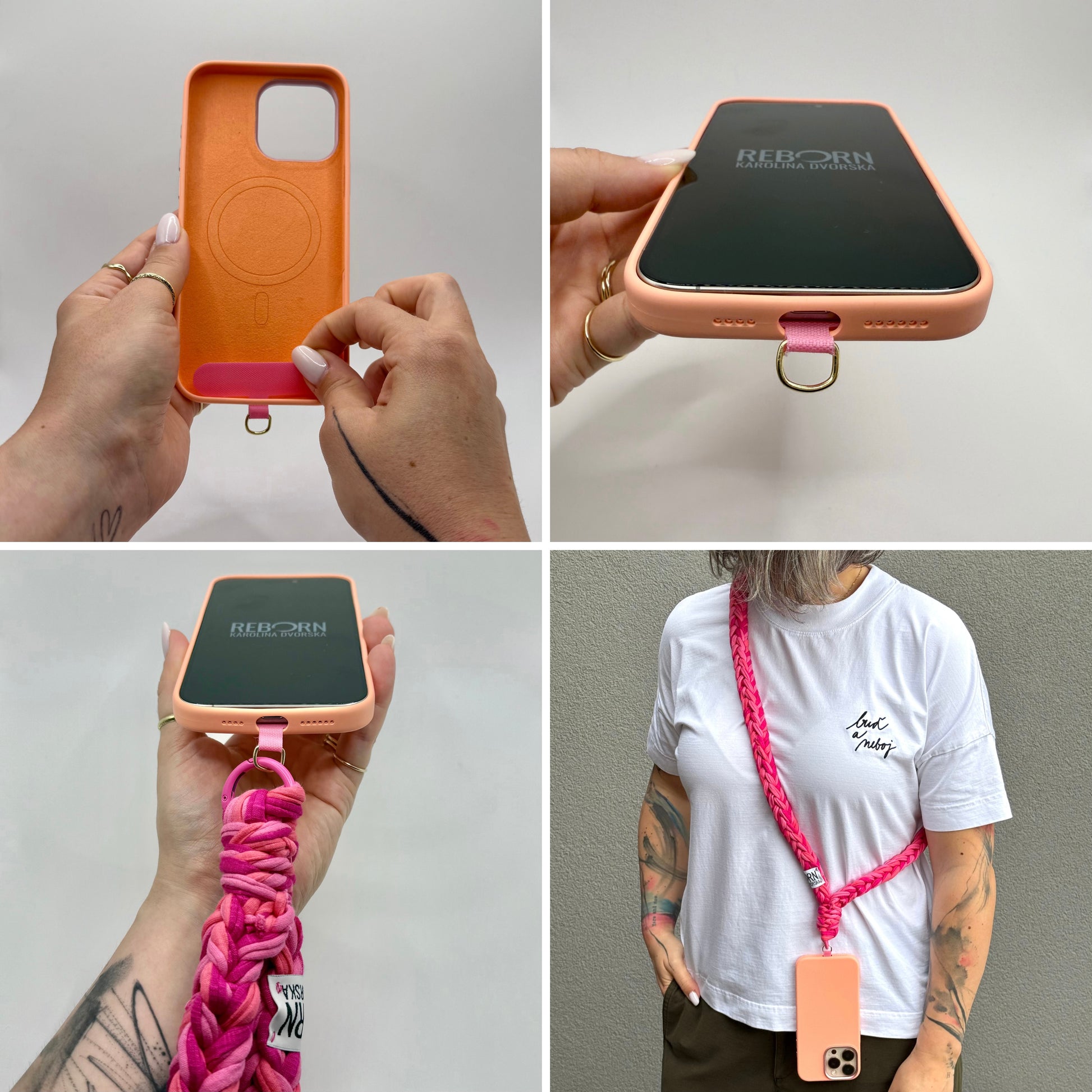 Crossbody popruh na telefon s vsadkou na úchyt do krytu. Popruh je lehce pružný.