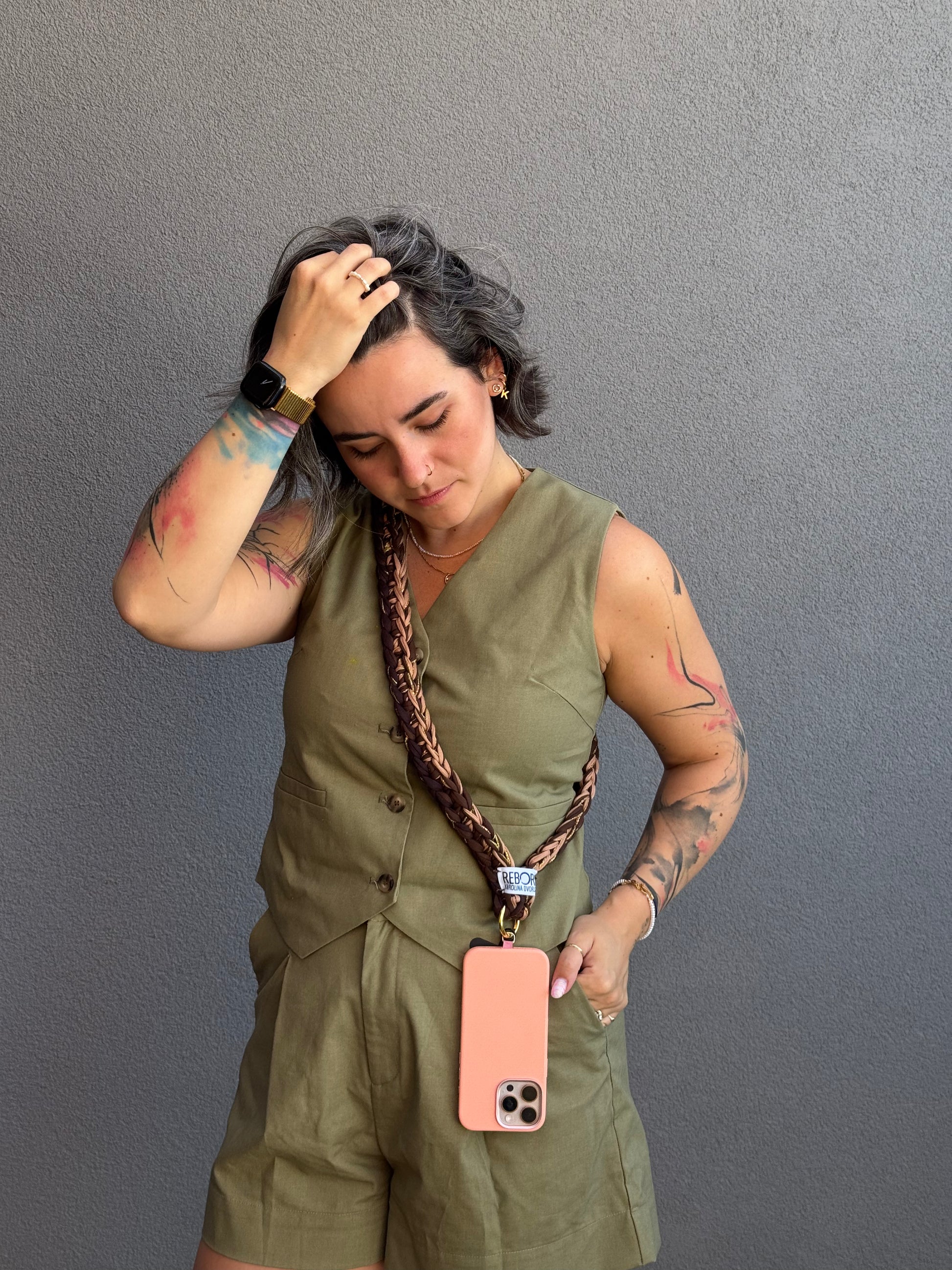 Crossbody popruh na telefon s vsadkou na úchyt do krytu. Popruh je lehce pružný.