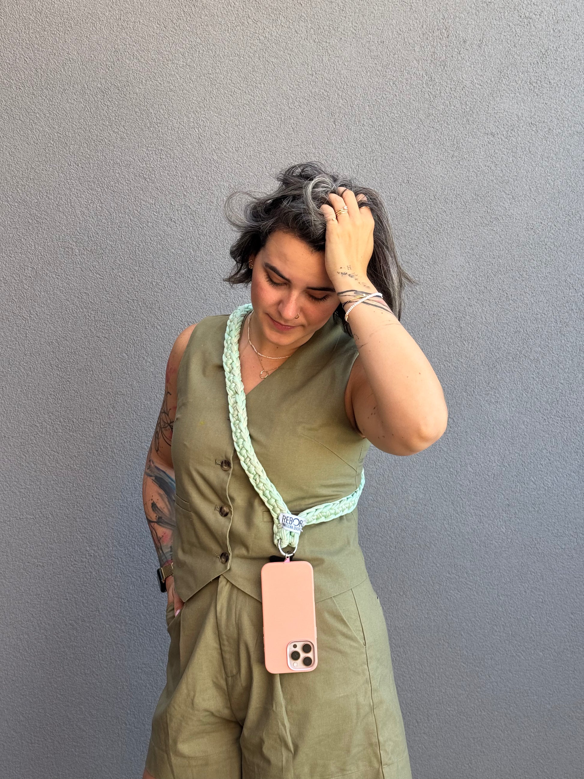 Crossbody popruh na telefon s vsadkou na úchyt do krytu. Popruh je lehce pružný.