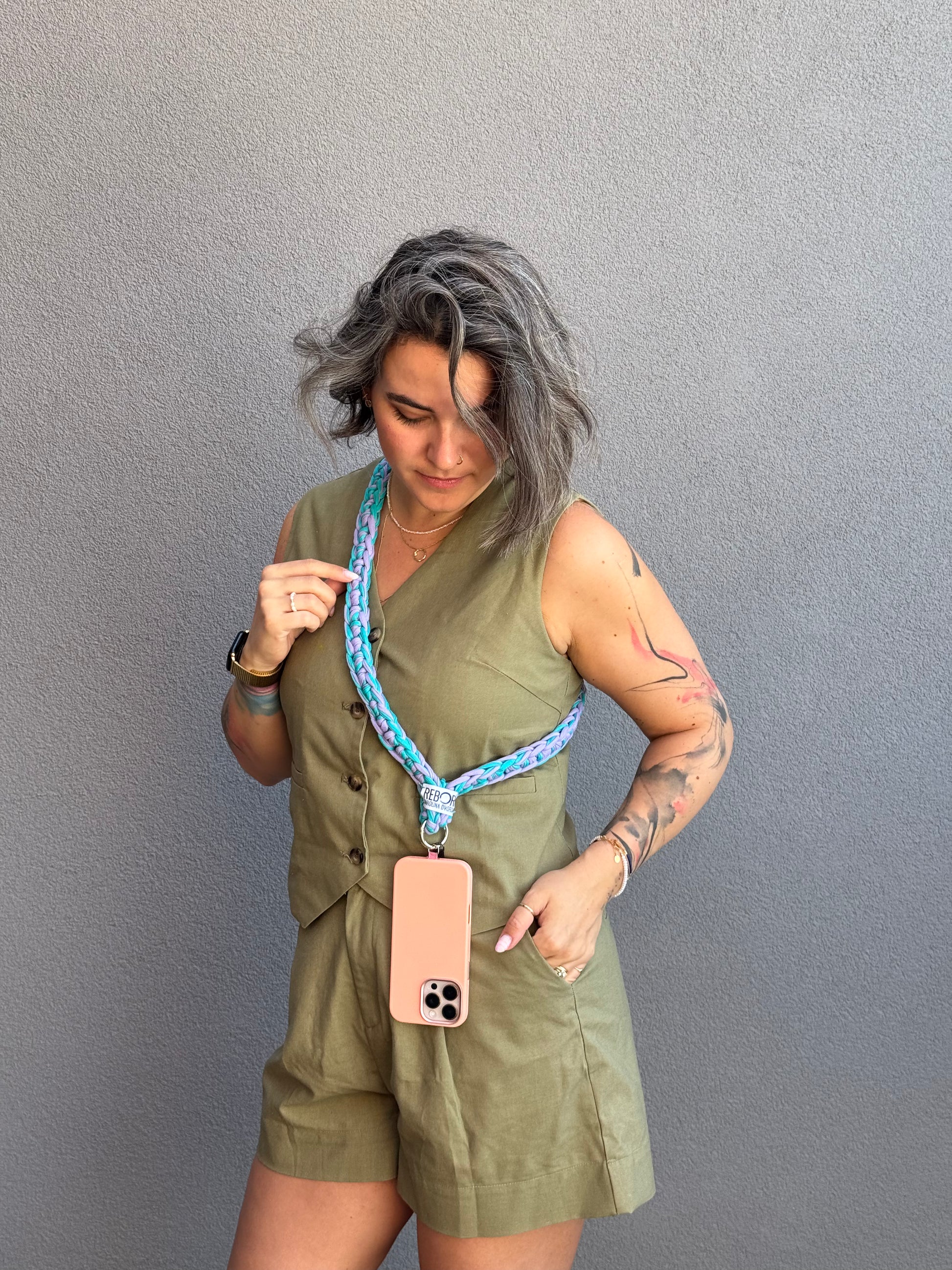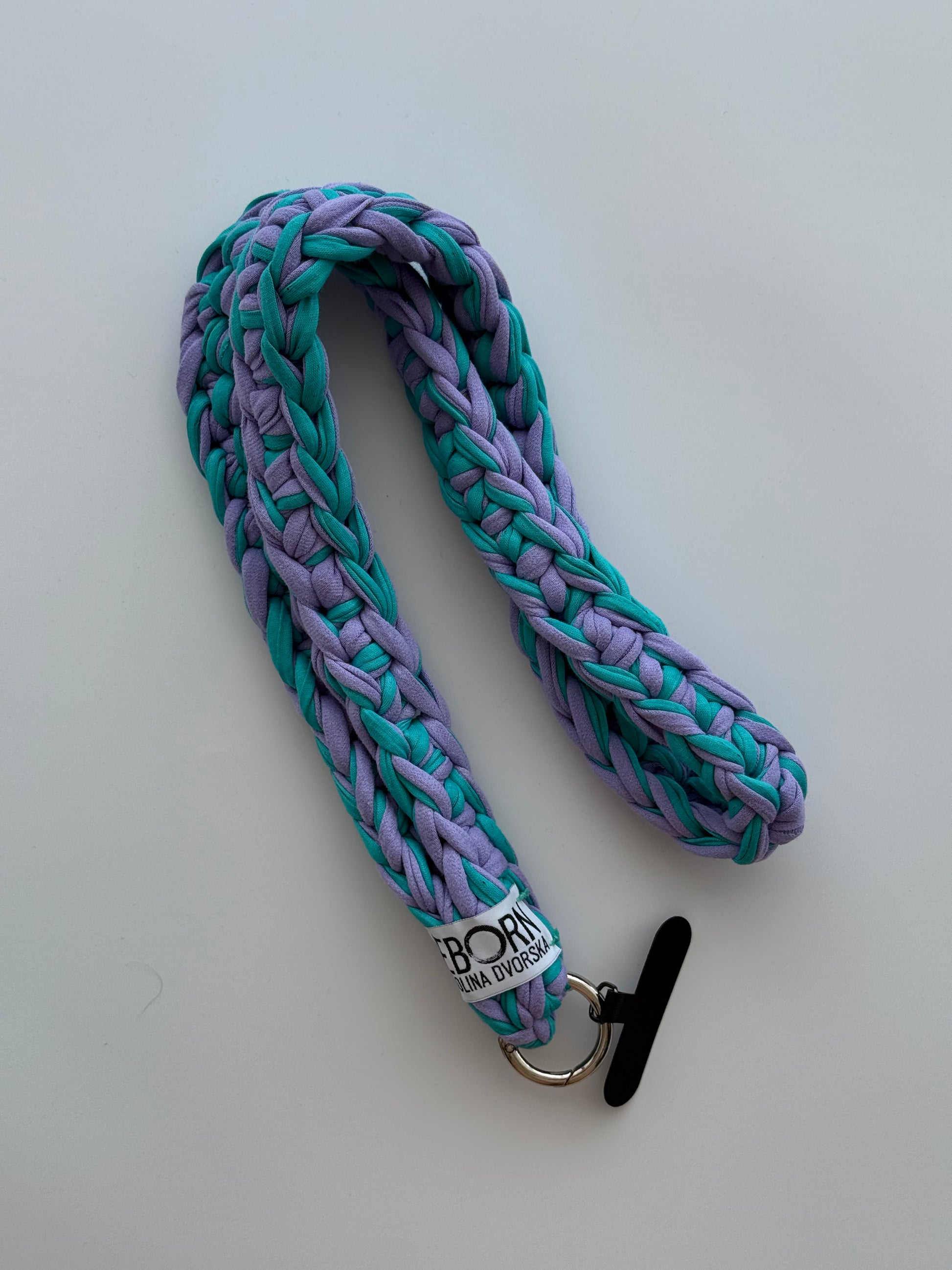 Crossbody popruh na telefon s vsadkou na úchyt do krytu. Popruh je lehce pružný.